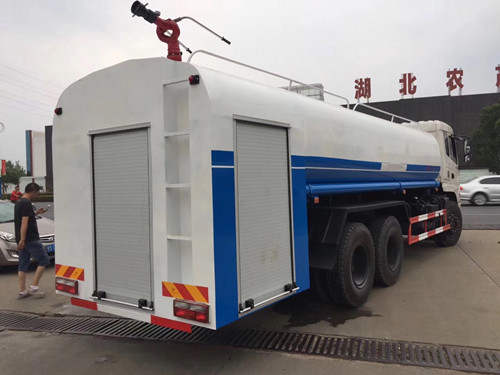 保定用戶購置15噸東風T5保溫運水車帶灑水車發車,該車夏季用戶綠化噴灑使用,而且駕駛室前置電動灑水炮,冬季用來運輸熱水,一車多功能。