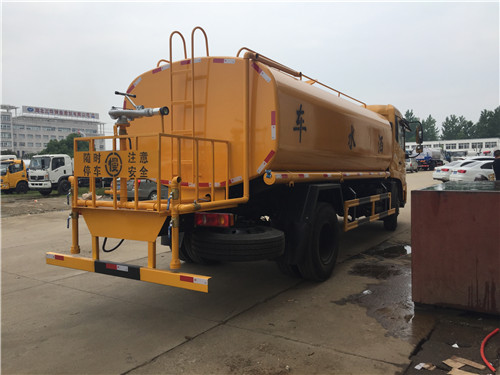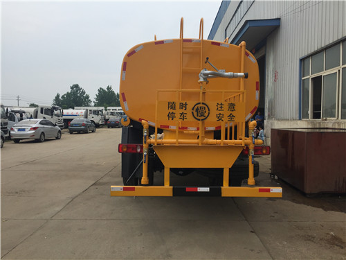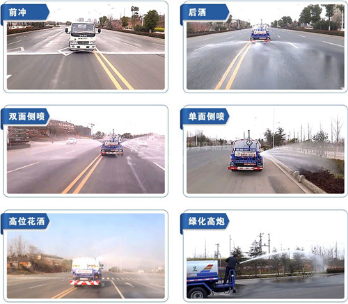 罐體采用4毫米厚武鋼產(chǎn)容積板焊接而成,內(nèi)設(shè)防浪板,程力大功率灑水泵,可自吸水,加壓排水,前沖15米寬,后灑壓塵,側(cè)噴花灑噴頭,尾高綠化高位水炮,射程28米,可調(diào)節(jié)水柱、大中雨、毛毛雨等,可做臨時消防滅火用。