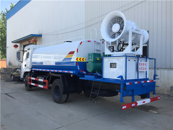 東風(fēng)12噸抑塵車選配50米噴霧機(jī)達(dá)到除塵效果。霧炮機(jī)是根據(jù)風(fēng)送原理,先使用進(jìn)口高壓泵、微細(xì)霧化噴嘴將水霧化,再利用風(fēng)機(jī)風(fēng)量和風(fēng)壓將霧化后的水霧送到較遠(yuǎn)距離,使得水霧到達(dá)較遠(yuǎn)距離同時(shí)能夠覆蓋更大面積,水霧與粉塵凝結(jié)后降落,從而達(dá)到降塵目的。