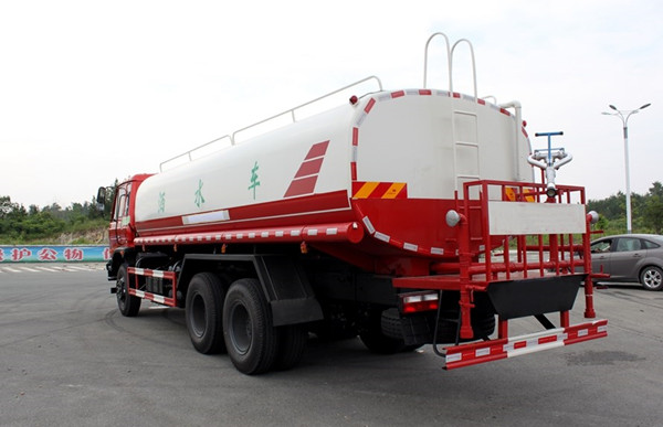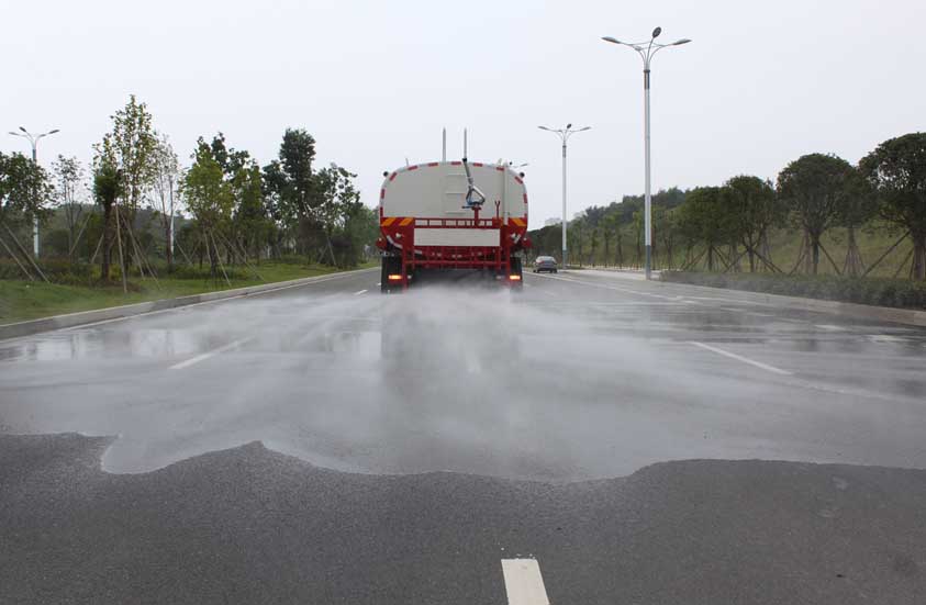 由發(fā)動機帶動變速箱,變速箱上安裝的取力器帶動灑水泵,灑水泵產(chǎn)生主要動力,將罐體內(nèi)部的液體通過管網(wǎng)噴灑出去。自吸高度:≤7m,灑水寬度:≥20m,最大射程:≥28m;可調(diào)節(jié)成柱狀,射程≥28m;也可調(diào)節(jié)成霧狀,射程≥5m。前噴后灑,前裝有鴨形噴嘴或圓頭沖嘴,后面裝有圓柱開灑水噴嘴或蓮蓬頭噴嘴,后部有一工作平臺,裝配有高壓水炮。后部還可裝8個噴嘴(選裝)噴水器一般用于沖洗街道。