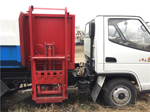 操作開提升控制閥將垃圾桶隨提升機(jī)向上升起并翻轉(zhuǎn)傾斜,桶內(nèi)垃圾被倒入車廂內(nèi)完成垃圾單次裝載,反向操作提升控制閥,垃圾桶隨提升機(jī)而放下;完成垃圾裝載后再進(jìn)行傾卸時(shí),操作自卸控制閥,垃圾箱繞后翻轉(zhuǎn)軸傾斜體舉,箱體后門打開,垃圾傾卸出箱體;起該車由液壓控制系統(tǒng)來完成該車的提升機(jī)的上升和下降及垃圾的自卸功能,降低了工人的勞動(dòng)強(qiáng)度和改善了工作環(huán)境。