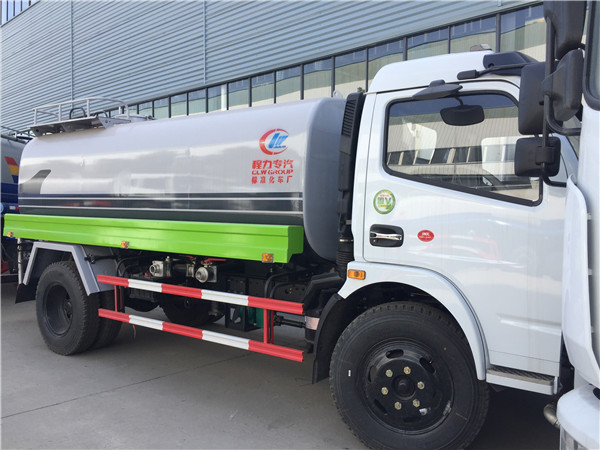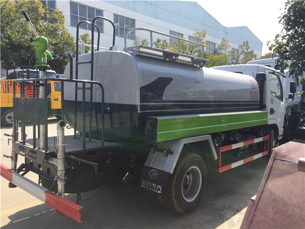 小多利卡5方灑水車(罐體容積:5立方):該車采用東風朝陽柴油發動機,一汽錫柴柴油發動機和昆明云內柴油發動機,白色前翻駕駛室,7.00-16輪胎,汽剎, 5檔變速箱,2噸前橋,4噸后橋,整車外形尺寸:長×寬×高(mm) 5990/1980/2390,總質量(kg)7360,額載質量(kg)3870。罐體有效容積:5噸,帶國家免征公告。