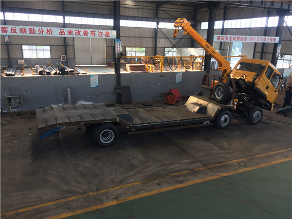 東風前四后八凹梁隨車吊,前四后八凹梁隨車吊采用凹梁下沉結構好處在于平板離地高度低重心穩(wěn),專利凹式設計,凹梁式隨車吊平板車,凹式隨車吊平板車,主要用于30噸左右挖掘機運輸,裝載機運輸,收割機運輸,壓路機運輸?shù)裙こ虣C械和不可拆卸物體的運,本產品是我們廠家專利產品,全國有此公告僅此一款,缺點在于凹梁設計易斷大梁和前方向拐臂,采用TT530豪華活D913駕駛室,玉柴310馬力國五發(fā)動機,5.5噸前橋13噸后橋,法士特10檔變速箱,10.00R20鋼絲胎,方向助力、斷氣剎、abs防抱死、空調,總質量31噸,上戶噸位18.45噸,車身自重12.35噸,標準型上裝橫梁采用12*12規(guī)格6mm厚方鋼,整根貫穿式設計,保證承載性能,貨箱平板10mm厚花紋板;重載型上裝橫梁采用12*10規(guī)格8mm厚方鋼,整根貫穿式設計,承載性能更好,貨箱平板8mm厚花紋板,爬梯采用重載加強型設計,采用三道筋雙簧加固處理,帶有后支腿,平板帶有斜支撐,貨箱平板可以伸縮,伸出3米,縮回2.5米,是運輸30噸-40噸大型挖掘機、大型工程機械等最理想的拖車。