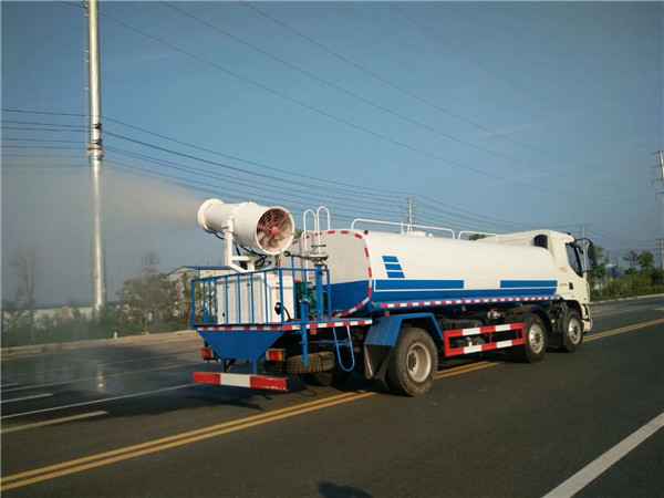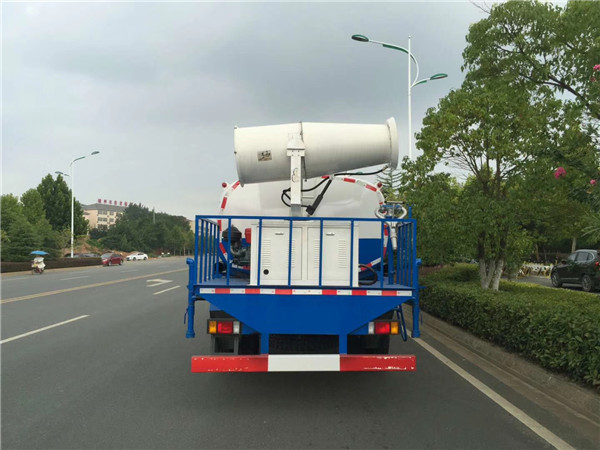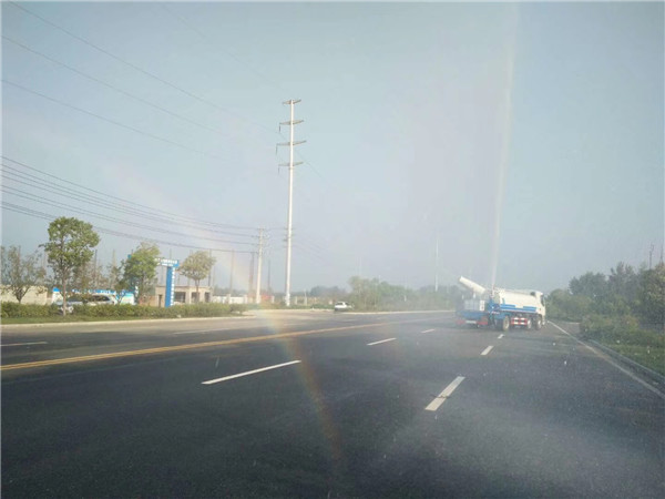 灑水車后工作平臺安裝有湖北程力公司自行設計的扇形噴嘴,主要對路面進行保潔和壓塵,灑水寬度可達14m以上(角度可自行調(diào)整)。該裝置的優(yōu)點為灑水呈霧狀或半霧狀,具有較好的壓塵和增濕效果。