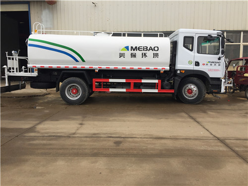 改裝配置:罐體用4MM碳鋼板制作,罐內隔板具有防波作用,以減低汽車行駛時罐體液體的沖擊。整車帶一個專用灑水泵(垂直最大吸程6米),灑水寬度14米,射程28米。多功能灑水車配備2個前沖(噴)(能將路面泥巴、塵土、垃圾沖干凈);2個后灑(能均勻地將水灑在路面,一次灑水寬度14米)、2個側噴(花灑)(能均勻地將路旁綠化帶澆灌)、帶1個后工作平臺,平臺上安裝1個綠化灑水高炮(灑水炮可全方位旋轉,可連續調成直沖狀、大雨、小雨、毛毛雨,霧狀可調節沖洗高大樹木),引水時間<5min,流量90m3/h。帶1個消防接頭,帶1個自流閥,1個過濾裝置、人性化爬梯及側防護欄,安裝灑水音樂喇叭。