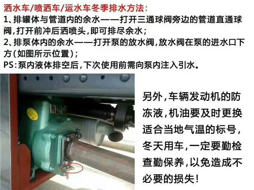 5、灑水車整車水路系統無防凍裝置,因此嚴寒地區,氣溫攝氏度以下使用后,應立即將水泵、水罐及水路系統中的積水全部放凈,注意水泵放水螺塞放水后應關閉嚴密,確保密封,否則將影響水泵吸水。