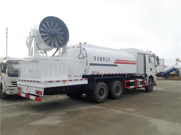 目前最受房地產歡迎的多功能抑塵車為噴霧抑塵車,該車除了常規的抑塵車的配置以外,還加裝了一套噴霧系統,噴霧系統主要由電機,電泵和噴灑總成組成,最大作業半徑為35米,可以遙控電控,噴霧系統可以旋轉,點頭工作。噴霧系統最大電機功率高達5.5千瓦,水泵點功率6千瓦,風機攜帶18個噴霧頭,噴霧頭可更換。