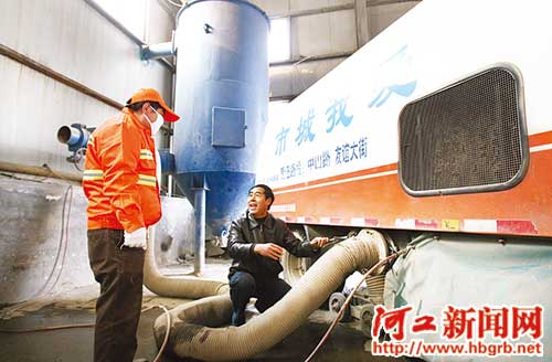在掃路車車廂下裝上一根大管子,直接吸走粉塵、雜物,最大程度地降低揚塵現象。近日,在石家莊市橋西區環衛大隊粉塵清倒車間,這臺巨型“吸塵器”和他的發明人——環衛大隊副大隊長劉秀江給我們介紹了這臺掃路車。