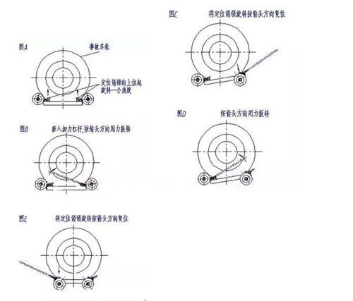 圖D,按照第三步,將加力桿套入另一個杠桿柄按照箭頭方向用力扳轉到圖E狀態。