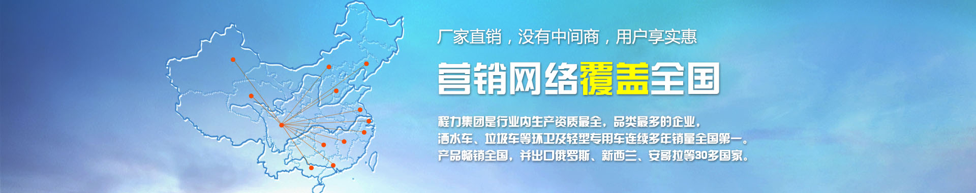 我公司致力于開發生產銷售專用汽車為已任,為您量身打造方便實用,耐用的專用汽車,其主導品種有園林綠化灑水車、環衛灑水車、油罐加運油車、吸糞車、吸污車、擺臂、掛桶、密封式垃圾車、廂式運輸車、消防車、半掛車、自卸車、水泥車、隨車吊等八大系列100多個品種300多個車型。同時批發東風、解放、福田等各種二類底盤。目前我公司銷售網絡基本已覆蓋全國各地,具體如下。